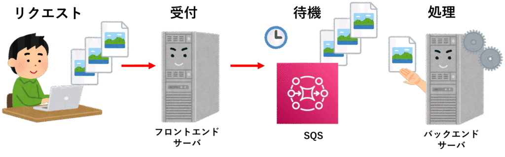 例えば、ユーザーからの画像アップロード処理を考えます。リクエストを直接処理するのではなく、一旦Amazon SQSのようなキューに溜め、バックエンドのサーバーが自分のペースで画像を処理するようにすれば、フロントエンドの応答性を損なうことなく、重い処理を非同期で実行できます。